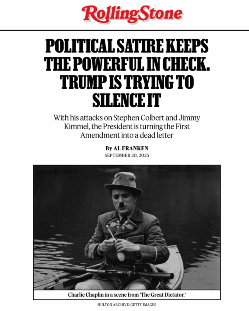 I wrote my thoughts on the Kimmel cancellation and Trump’s latest power grab for Rolling Stone. I realize he’s going back on the air tonight, but let’s not kid ourselves, the threat of cancellation is still very much alive. Read it below and then donate!